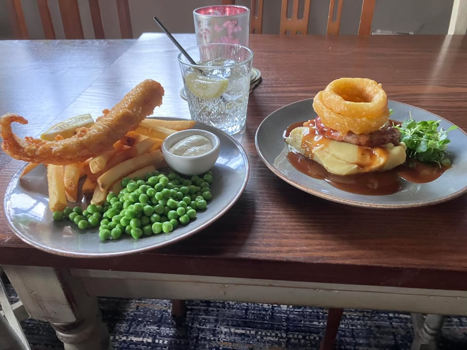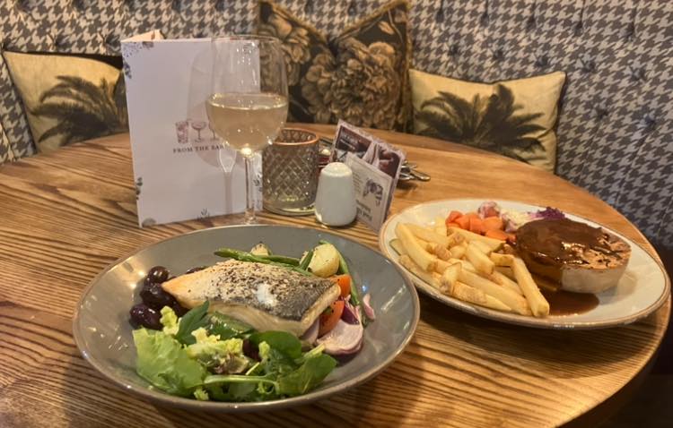 2 of our favourites , Mediterranean Salmon Salad and Steak and Ale pie, with a cold glass of Pino Grigio 01942 364476 to book We are open every day from 12pm