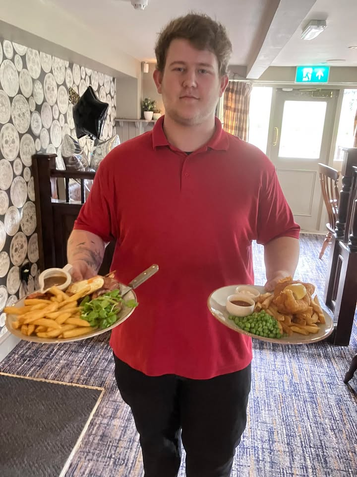 Harry with 2 of our most popular plates, mixed grill and ham hock 01942 364476 to book a table